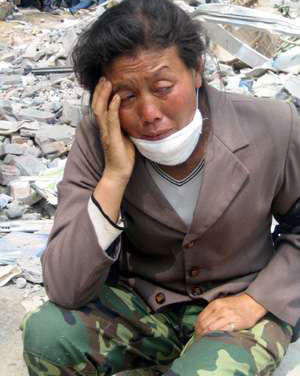 那邊是盼望著孩子歸來的母親,一名坐在書堆上的婦人已經(jīng)泣不成聲。她說,大地震令她死了兩個(gè)孩子,其中一個(gè)剛滿17歲,都還沒有找到,等待消息的日子,她都吃不下東西。她一面頻頻回頭看著遠(yuǎn)遠(yuǎn)的挖掘現(xiàn)場(chǎng),一面說,如果挖出了她的孩子,她無論怎樣都會(huì)認(rèn)得出來,因?yàn)楹⒆宇i項(xiàng)上還戴著一塊玉,是龍的形狀。說罷,她又再滿懷希望地沖向抬著擔(dān)架的救援人員……。
