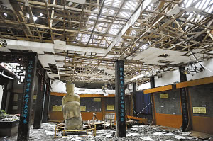 在正殿門前,一面書著“二王廟”三個(gè)大字的巨匾躺在地上,它是愛國將領(lǐng)馮玉祥的手跡,一筆一畫蒼勁有力,但是上面已經(jīng)遍布沙塵。在三官殿外,李冰威震天下傳頌千古的治水六字訣,本來緊嵌墻上的照壁“深淘灘,低作堰”被震成無數(shù)碎片,一片片地橫于地上。