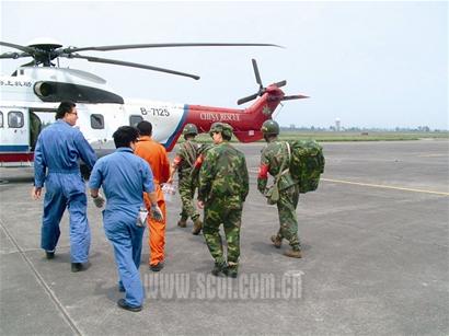 5月21日清晨,廣漢機場緊張有序地展開營救8名被困工人的行動,多架飛機飛向綿竹清平大山偵察。空降兵某師派出小分隊,背著繩索、攜帶衛(wèi)星定位系統(tǒng)進行救援。