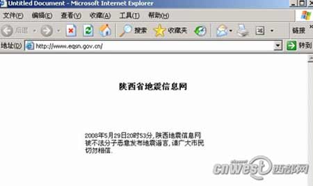 5月29日22點左右,記者登陸陜西地震局網(wǎng)站,已經(jīng)無法看到正常的地震信息網(wǎng)頁面。頁面上只有兩行簡單文字,“2008年5月29日20時53分,陜西地震信息網(wǎng)被不法分子發(fā)布地震謠言,請廣大市民切勿相信。”