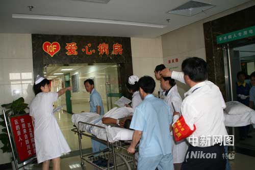 記者坐上載著傷員救護(hù)車,警車開道一路綠燈直達(dá)救治的醫(yī)院,在車上傷員家屬告訴記者:到處都是我們的親人,一路上大家都很受照顧,已經(jīng)感受到家庭的溫暖。下午四時許,駛進(jìn)蘇北醫(yī)院,為了迎接傷員,醫(yī)院早就開始了準(zhǔn)備,在住院十病區(qū)開辟了 “愛心病區(qū)”。王靜成院長稱,這是我們醫(yī)院最好的病房,醫(yī)院為四十名災(zāi)區(qū)傷員親人配備了經(jīng)驗豐富的醫(yī)護(hù)人員,確保醫(yī)療安全,盡量降低致殘率,讓他們安心治病、早日康復(fù)。