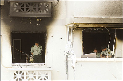 事發(fā)房間損毀嚴(yán)重,消防員在勘察現(xiàn)場。