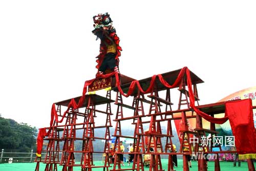 廣東南海西樵山上的天湖公園,一支來(lái)自廣東臺(tái)山的傳統(tǒng)南獅正在進(jìn)行絕技表演, “獅子踩沙煲”、“南獅勇闖鐵板橋”接連上演。