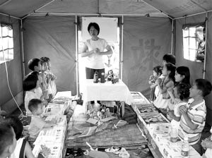 成為最牛帳篷小學(xué)的校長,非常偶然。來自北京的幾名志愿者觸動了我。19日,哀悼日第一天,我路過受災(zāi)群眾安置點,看到有人正擠在帳篷里給孩子們上課。我就找機(jī)會和他們聊天,這時我才發(fā)現(xiàn),他們來自北京的幾所高校,有教授,有博士后,差不多都是高級知識分子。我對他們馬上產(chǎn)生了一種敬意。
