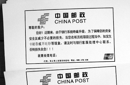 經(jīng)過審訊,班某和甘某很快交代了他們詐騙作案的過程。據(jù)二人交代,他們先用塑料板將ATM機的出鈔口堵住,并在ATM機上貼上提示,內(nèi)容是:“尊敬的客戶,當(dāng)您取款不出鈔時,請及時撥打銀行服務(wù)電話××××、××××與客服中心聯(lián)系,否則后果自負(上圖)。有粗心的客戶提款不出鈔時,可能會撥打廣告牌上的服務(wù)電話。
