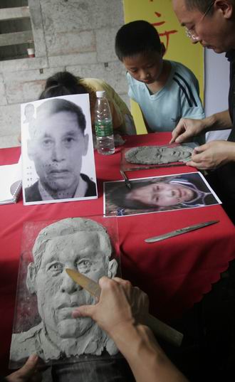 在展場(chǎng)內(nèi),雕塑家們開始現(xiàn)場(chǎng)創(chuàng)作浮雕頭像。每位雕塑家的手邊都有一張真人大小的遇難者失蹤者的正面肖像照,上面還打印著主人的姓名、籍貫、出生日期、死亡日期。雕塑家們將雕塑專用泥土細(xì)心地抹在照片上,然后用雙手捏塑出一個(gè)和照片大小完全一樣的浮雕塑像,其后還要經(jīng)過(guò)多項(xiàng)工序加工。據(jù)譚云介紹,經(jīng)過(guò)精密計(jì)算,每塊銅板真人浮雕頭像的制作成本將控制在600元以內(nèi),全部完成預(yù)計(jì)將用兩到三年的時(shí)間。(華西都市報(bào) 記者陶玲 胡曉 攝影朱建國(guó))