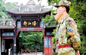 兩千多年前,秦蜀郡守李冰父子修建了雄偉的水利工程都江堰,使之成為巴蜀大地上偉大的防洪和灌溉工程,四川也因此成為富饒豐厚的“天府之國”。然而,5·12大地震不僅讓都江堰市區(qū)受損嚴(yán)重,世界文化遺產(chǎn)青城山-都江堰也在地震中遭到了不同程度的損壞。日前,在都江堰市街頭,舉目看去,絕大多數(shù)受損樓宇中皆人去樓空,而幽甲天下的青城山和澤被天府的都江堰景區(qū)也已暫時(shí)封門謝客,景區(qū)內(nèi)除了巡邏的解放軍戰(zhàn)士和救災(zāi)帳篷,已經(jīng)看不見一個(gè)游人。都江堰大壩旁的一條游客通道上,活動(dòng)板房建設(shè)工人正在緊張施工,曾經(jīng)游人如織的景區(qū)道路上,靜靜豎起一大排藍(lán)白相間的板房。