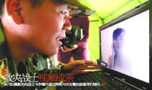 “看見啦!hello,媳婦兒!”昨日16:18,都江堰學(xué)府路一處板房搭建地的綠色帳篷內(nèi),27歲的新郎倌終于看見了電腦屏幕上穿著潔白婚紗的新娘。整個(gè)婚禮僅僅持續(xù)了9分鐘,這是一場簡單得不能再簡單的婚禮,卻跨越了千里!新郎倌因?yàn)殡S部隊(duì)入川參加抗震救災(zāi),無法如期趕回安徽家中與新娘舉行婚禮,便通過這種方式,完成了對(duì)新娘的承諾。