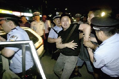 阻礙執(zhí)法的民警被帶上警車。本報記者 董世彪 攝