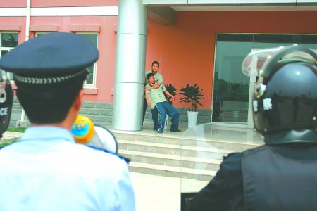“張某,你已經(jīng)被包圍了,放下手中的兇器舉手投降,這是你唯一的出路!否則,你將承擔(dān)嚴(yán)重的法律后果!”宣教組對“罪犯”進(jìn)行勸說教育!吧購U話,叫監(jiān)獄領(lǐng)導(dǎo)來!不傷害人質(zhì)可以,你們給我準(zhǔn)備兩萬塊錢,再準(zhǔn)備一輛車,我就放了他!”張某惡狠狠地說,并把玻璃頂在李某的喉部,李某直叫“救命”。