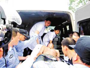 警察和醫(yī)護(hù)人員將受傷的匪徒抬上救護(hù)車。