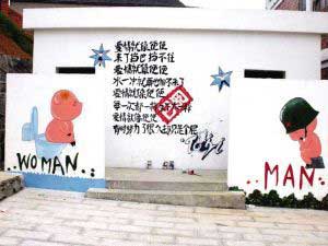 作者自述:聽(tīng)當(dāng)?shù)鼐用裰v,這本來(lái)只是一座很普通的公廁,后來(lái)畫(huà)上卡通畫(huà)、配上搞笑的文字,最可愛(ài)的是一個(gè)大大的“已閱”紅印蓋在打油詩(shī)上。我猜想,這個(gè)做外墻裝飾的弟兄是不是剛失戀,將自己的滿腔感受在廁所外墻上來(lái)了個(gè)寫(xiě)照?