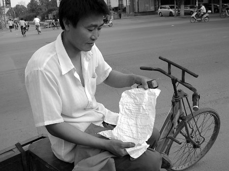 下午5點(diǎn)55分,記者終于見(jiàn)到了馬師傅,他看上去老實(shí)本分,裝扮樸素,鞋和褲子都已經(jīng)破了,蹬著一輛破舊的三輪車(chē),眼睛有些紅腫,在接受民警詢(xún)問(wèn)的時(shí)候,還不時(shí)惦記著回家收自己的菜攤。