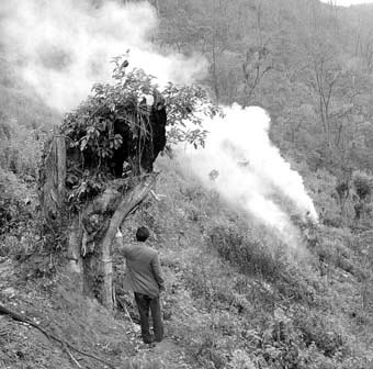 從西雙版納景洪市往景訥鄉(xiāng)走,一路上看到的全是光禿禿的山頭,樹木橫七豎八地倒在一旁,還冒著滾滾濃煙!敖鼛啄暌?yàn)橄鹉z價(jià)格飛漲,整個(gè)西雙版納開始大規(guī)模毀林種膠。樹木砍倒后運(yùn)不出去,就只有放火燒掉,同時(shí)還能做橡膠林肥料,我們這里又回到了‘刀耕火種’的原始社會(huì)了!笨蛙囁緳C(jī)說。