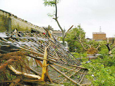 “好嚇人!忽然一陣陣巨響傳來,我馬上呼喚村民快跑!闭f起事情經(jīng)過,村民甄先生驚魂未定。他告訴記者,昨天上午9時(shí)51分,他正在錦屏禮堂里維修,只聽“呼”的一聲巨響,緊跟著狂風(fēng)就吹進(jìn)來,他趕緊去關(guān)門,手一下子就被門夾住了。當(dāng)他跑出大門后看到,村民的房子頂部所有的磚瓦已經(jīng)被掀掉,碎片不斷地跌落地上,強(qiáng)勁的龍卷風(fēng)把他也吹得倒退幾步后跌倒在地。只見木頭四處亂飛,噼里啪啦地在響。一股強(qiáng)風(fēng)一直在房屋附近盤旋,大塊的鐵皮夾著磚頭、瓦塊等在空中飛舞,旋轉(zhuǎn)了幾圈后,“砰”的一聲落了下來。強(qiáng)勁的龍卷風(fēng)大約持續(xù)了3分鐘,所到之處只聽到“呼呼”的勁風(fēng)響。