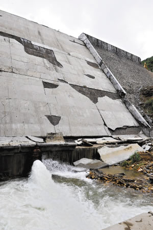 在一番跋涉之后,記者終于來到了水庫大壩前,只見壩高在20米左右,長(zhǎng)約100多米,壩體由漿砌石筑成,能看到出現(xiàn)的一些裂縫。不少巨石塊已經(jīng)剝落,由于水壓過大,壩體上個(gè)別部位隆起了碗口大的鼓包。攀上壩頂后,情景更讓人觸目驚心,厚厚的壩體已經(jīng)嚴(yán)重扭曲變形。