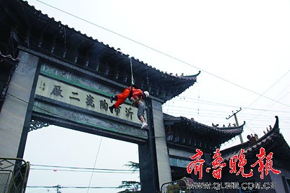 就在此時(shí),消防員飛身?yè)淞松先ィ瑢⒃撆颖ё。由于這名女子拼命掙扎,二人雙雙從門(mén)樓上掉了下來(lái),幸虧消防員身上的繩子才使兩人懸在半空中。
