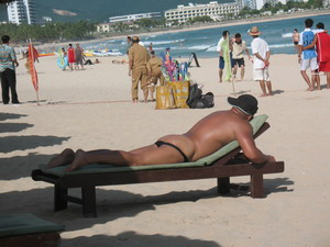 經(jīng)過(guò)幾天觀察,記者發(fā)現(xiàn)大東海景區(qū)沙灘,的確有不少裸泳、裸曬游客。在大東海景區(qū)東、西兩側(cè)均有裸泳、裸曬者,西側(cè)寶宏酒店沙灘上主要以國(guó)外客人為主,東側(cè)南中國(guó)酒店沙灘主要以?xún)?nèi)地客人為主,他們大部分都是中年男人,一來(lái)到海邊就先在海里游泳,然后擺出一副旁若無(wú)人的樣子赤裸著躺在沙灘上曬太陽(yáng)。