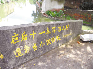 記者隨即撥通了元昌村民小組所屬的順德區(qū)杏壇鎮(zhèn)路涌村委會(huì)書記周肖杰的電話,他委托一位不愿意透露姓名的村干部接受了記者的采訪,稱標(biāo)語是近日貼出的,”是我們小組20多戶人家開會(huì)集體制定的這條村規(guī)民約,我們也是實(shí)在沒有辦法,因?yàn)榇謇锩娼?jīng)常發(fā)生被盜事件,村民損失很大,所以成立了防偷小組,貼出這樣的標(biāo)語,也是為了晚上巡邏時(shí)方便些。也希望阻嚇那些犯罪分子,不要隨便進(jìn)我們村!