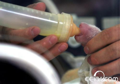 2008年7月7日上午,在中國保護大熊貓研究中心雅安碧峰峽基地,工作人員正在育嬰箱內,給大熊貓幗幗7月6日剛出生一對雙胞胎的老大,成功進行人工進食喂養(yǎng);而雙胞胎的老二目前則由大熊貓幗幗親自給它進行母乳喂養(yǎng)。