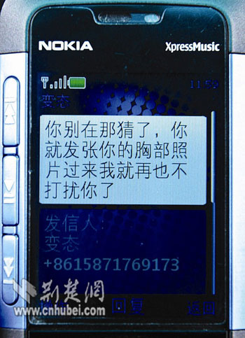 “你只要把胸部照片發(fā)過來,我就罷手!弊蛉,收到對(duì)方提出的無理要求,漢口女士小霞(化名)精神幾乎崩潰。近半個(gè)月來,這樣的下流電話和短信每天都在折磨著她。