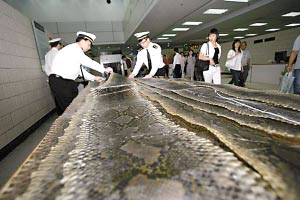 16張數(shù)米長(zhǎng)的蟒蛇皮,展開鋪在海關(guān)查驗(yàn)臺(tái)上。日前旅客賴某想走私這些國(guó)家一級(jí)保護(hù)野生動(dòng)物蟒蛇皮進(jìn)境牟利,在拱北口岸就被查獲。這些蟒蛇皮每張長(zhǎng)度在3~5米左右。這是拱北口岸首次查獲旅客攜帶蟒蛇皮進(jìn)境走私案。(記者陳治家 通訊員黃慧賢、張建林?jǐn)z)