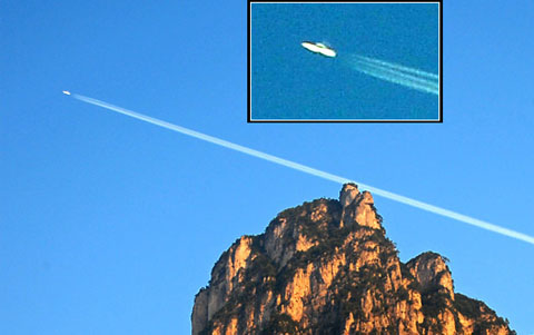 7月13日早上5點(diǎn)40分左右,網(wǎng)友曹先生在河南輝縣八里溝景區(qū)拍攝“石人迎客”景點(diǎn)時(shí),突然看到前方天空有一個(gè)白色亮點(diǎn)出現(xiàn),速度像飛機(jī),形狀又如飛艇,但上部突出,似乎又像傳說中的“飛碟”。不明飛行物第一次出現(xiàn)在“石人迎客”位置的時(shí)間是5:39,但尾部沒有噴氣,5分鐘后,不明飛行物第二次出現(xiàn)在這個(gè)位置,時(shí)間是5:44,尾部拖著一條長長的尾巴,好像在不大的半徑里繞圈飛行,而且在飛行過程中一直沒有聽到其發(fā)出聲音。曹先生趕緊用相機(jī)將其拍攝了下來(如圖),雖然不是長焦鏡頭,但由于用了三腳架,能夠比較清晰地看出不明飛行物大概的樣子。
