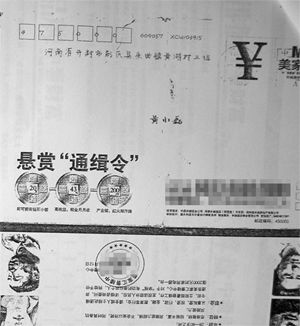 進(jìn)門(mén)后,黃明華看到二老呆坐著,手里拿著“通緝令”。他打開(kāi)信封,里面其實(shí)是鄭州一家房地產(chǎn)公司的廣告。上面寫(xiě)著“懸賞通緝”,左右兩側(cè)分別有3個(gè)人頭素描,“很像通緝犯”。