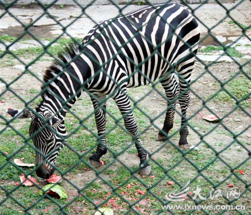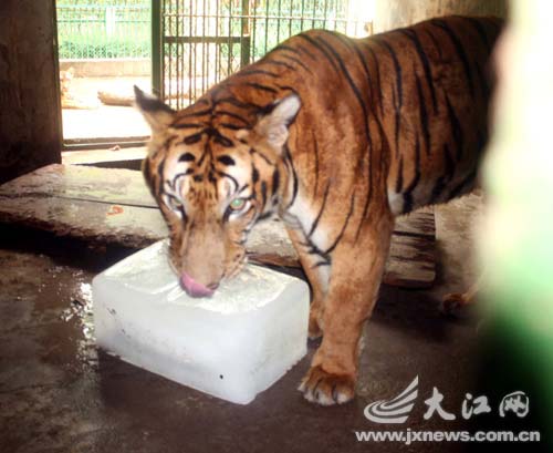 16日,記者在南昌市動物園看到,老虎正抱著大冰塊睡著大覺!疤鞖馓珶,我們每天都要消耗近600公斤冰塊為5只老虎降溫。3只大象每餐也要吃掉約75公斤西瓜!憋曫B(yǎng)員告訴記者。記者看到,河馬喜歡泡在水池里,熊貓則躲在空調(diào)房里愜意地打著盹,大象、斑馬忙著啃西瓜。