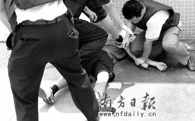 在對(duì)抓獲的兩名犯罪嫌疑人審訊期間,聯(lián)合專案組掌握到該團(tuán)伙另一名成員“阿文”藏匿在松崗街道某旅店。11時(shí)許,“阿文”察覺(jué)遭到警方圍捕,在松環(huán)路美食街附近先后持槍劫持兩名男子和一名女子作為人質(zhì)。聯(lián)合專案組民警立即組織疏散群眾,同時(shí)與嫌疑人周旋!澳莻(gè)歹徒很囂張,不斷地叫喊,來(lái)了近百名警察把他圍了起來(lái),場(chǎng)面很緊張,我都叫我老婆趕緊離開(kāi)!蹦繐粽哧P(guān)先生心有余悸地說(shuō)。