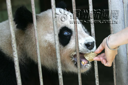 陳玉村介紹,“07”號大熊貓的檢查報告讓人們對它的健康狀況更加擔憂,“專家可能先給它作眼科手術(shù),目前我們先治它的眼睛潰瘍,之后,分別給它的眼睛動手術(shù),F(xiàn)在正用中藥對它進行先期治療,把中藥燉成湯,讓它當水喝。因為有藥味,它經(jīng)常不喝,工作人員就在里面放點它喜歡吃的食物哄它喝一點”。