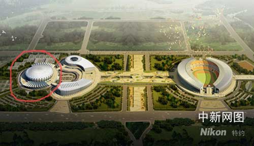 圖為濟南奧體中心設計效果圖,圖中紅圈所示即失火的體育館。