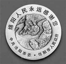 該抗震紀念章呈銀灰色,選用錫合金材料,直徑5.12厘米,厚5.12毫米。紀念章正面是北川震后全景圖案,上有“我們永遠記住5·12”字樣;背面是航拍的唐家山堰塞湖全景,上有“綿陽人民永遠感謝您”字樣,落款為中共綿陽市委、綿陽市人民政府。