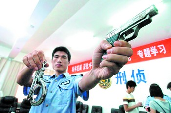 警方展示搶劫團伙所使用的仿制手槍和手銬等作案工具。小劉軍攝