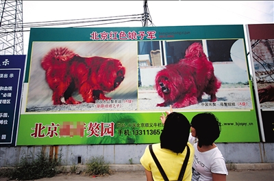 這幅廣告長約兩米,“北京紅色娘子軍”的字樣下,是兩張藏獒照片,毛色粽紅油亮。據(jù)了解,這是順義一家獒園的廣告!皬V告講噱頭,但也不能將藏獒比成紅色娘子軍啊!备浇用窀吲空f,這樣的廣告方式過了頭,看了心里特別不舒服。