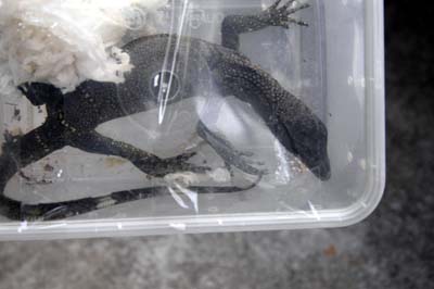 7月31日上午7時許,石井邊防派出所民警在泉州市南安石井碼頭對來靠臺灣貨輪進行例行檢查時,在船上的洗浴間內(nèi)發(fā)現(xiàn)了兩個可疑的紙箱,紙箱內(nèi)有幾十個大小不一的塑料盒子,盒子內(nèi)裝有色彩繽紛、形態(tài)各異的蜥蜴、青蛙、烏龜?shù)扰佬袆游铮s有200余只。隨后,邊防民警又在碼頭上抓獲了前來取貨的周某。