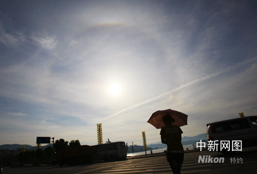 中新網(wǎng)杭州8月6日電(見習(xí)記者 張潔 通訊員 程賢高)“月暈三更雨,日暈午時(shí)風(fēng)”。2008年8月6日上午7時(shí)左右,在杭州市淳安縣千島湖畔,剛升上山際兩丈許的太陽周圍出現(xiàn)了較為明顯的彩色暈環(huán)。在氣象上,這種暈環(huán)就是“日暈”,是不太多見的大氣光學(xué)現(xiàn)象,預(yù)示著天氣將出一定變化。(完)
