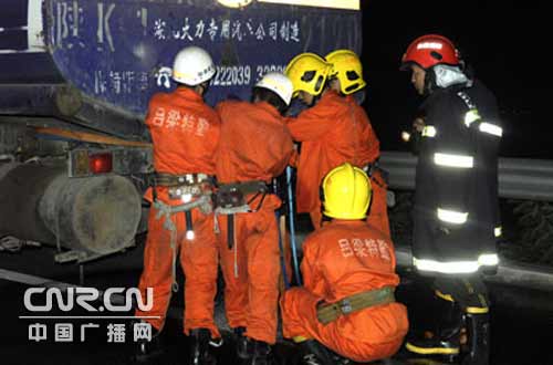 接到報(bào)警后,呂梁市消防支隊(duì)119指揮中心迅速調(diào)集6輛消防車,27名指戰(zhàn)員火速趕赴現(xiàn)場。經(jīng)詢問現(xiàn)場的知情人和對災(zāi)害現(xiàn)場的初步偵察,得知一輛車牌號為陜K1910裝有24噸汽油的油槽車從陜西榆林運(yùn)往山西呂梁市,在距離石高速口500米的下坡路段時(shí)與一輛大貨車發(fā)生追尾事故,車牌號為陜K1910油罐車卸油口被撞裂開一條大口,大量汽油呈噴射狀向外漏,沿高速路流淌距離長達(dá)1公里左右,此時(shí)只要有一點(diǎn)火星,就可能發(fā)生爆炸事故,高速路旁邊的居民區(qū)將夷為平地,情況萬分危機(jī)。