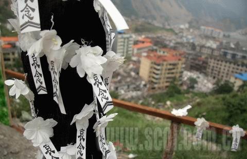 在一個被當?shù)厝朔Q為“三倒拐”的地方,鐵血四十師在此拉起了一方橫幅:沉痛悼念北川遇難同胞。橫幅下面擺放著一個大的花圈,花圈兩邊分別是假花拼成的“5·12”和“北川”字樣。橫幅下的欄桿上,密密麻麻貼著寫有“哀悼”二字的小紙條,每一個紙條,代表著一個亡靈。