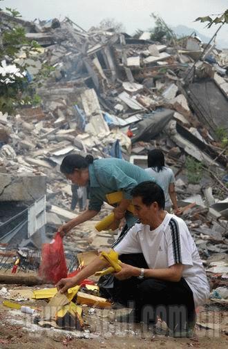 廖女士沿著兒子的上學路線走著,但哪兒還有路啊?都是一片廢墟。一塊“北川羌族自治縣惠農(nóng)服務中心”的牌子立在一塊空地上,它的后面,是一堆建筑垃圾!扒懊媸轻t(yī)院,醫(yī)院旁邊是幼兒園。”穿過曲山街,廖女士爬上了廢墟,艱難地走著,然后,在一個小平臺處停了下來,擺放好大花束,將紙錢點燃!皨寢寔砜茨懔恕阋浀没貋砜磱寢專业饶,聽到?jīng)]有,嗯?”雨水和淚水打濕了她的臉。