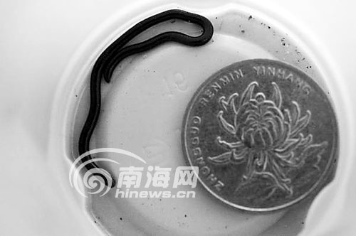 海南萬(wàn)寧后安鎮(zhèn)何先生18日早晨9點(diǎn)在自家后院抓到一條只有一根牙簽大小的類似蛇的生物(右圖),何先生對(duì)照本報(bào)曾經(jīng)報(bào)道過(guò)的重慶發(fā)現(xiàn)“世界最小的蛇”的文章后稱,他發(fā)現(xiàn)的生物才是真正的“世界最小”。小生物通體黑色,長(zhǎng)約6厘米。何先生告訴記者,他小時(shí)候也曾經(jīng)見到過(guò)這種生物,在海南鄉(xiāng)村、墻角、衛(wèi)生間等潮濕的地方就會(huì)碰到這種小生物。但具體這是哪種生物,學(xué)名怎么稱呼,到底有沒(méi)有毒,何先生稱不甚了解。(南國(guó)都市報(bào) 記者李域攝影報(bào)道)