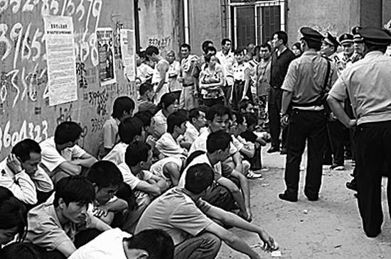 記者隨同民警清查時發(fā)現(xiàn),樓房內(nèi)幾乎每個房間都是房門緊鎖,任由外面的民警怎么敲門,里面的人就是不開門。在二樓的一個房間外,民警敲門足足幾分鐘始終無人開門,于是將門鎖撬開進(jìn)入,發(fā)現(xiàn)簡陋的客廳里,靠四周墻壁坐著20多個年輕人,男的占大多數(shù)。