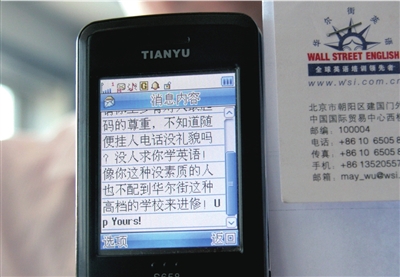 昨天,市民劉先生反映,他因掛斷華爾街英語國貿(mào)中心課程顧問的電話,對方于8月9日中午給他發(fā)來辱罵短信,有罵其沒有素質(zhì)、不配到高檔學(xué)校進修等內(nèi)容。經(jīng)交涉,華爾街英語方面向其致歉,并對員工作出警告處理。