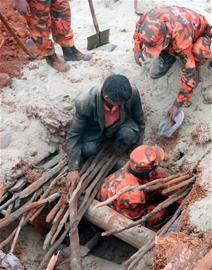 求救的男子撲通一聲跪倒在地,淚水瞬間打濕了面頰;協(xié)助救援的村民們也都紛紛捂著臉,退向外圍;文偉、薛紅兵、鐘銀和劉小威低下頭,悄悄抹去眼淚,“干了這么多年救援,就從沒見過這樣的場面!睘榱瞬粋δ概畟z的遺體,4個人把鋤頭、鐵鍬等全部扔了出去,改為徒手挖掘,“每一秒鐘,我都有一種想跪倒的感覺,我們所面對的,已不是她們的遺體,而是偉大的母愛。”