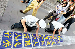 據(jù)宣武城管大柵欄分隊隊長介紹,大柵欄商業(yè)街的外地游客比較多,有些人總是在盲道上走,無形中給盲人出行帶來不便。由于人多不可能一個個地勸,于是他們就想出了這個辦法。