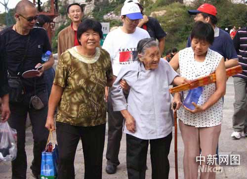 有人說(shuō),運(yùn)動(dòng)的感染力是無(wú)窮的。這話(huà)聽(tīng)起來(lái)有些虛無(wú)縹緲,但實(shí)際上卻的確算的上至理名言。不時(shí)跑過(guò)的登山選手,那氣喘吁吁、揮汗如雨卻從不肯停下來(lái)休息的精神著實(shí)感染了不少游客。一時(shí)間,竟出現(xiàn)了游客們與選手“賽跑”的有趣畫(huà)面。而一位來(lái)自山東聊城的91高齡的老人,看著身邊不時(shí)跑過(guò)的年輕人,不知道是不是也令她自己頓時(shí)年輕了起來(lái),竟在家人的攙扶下從南天門(mén)一步步走上了泰山之巔。