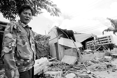 “為了讓我們乖乖交出‘保護費’,這伙人不僅打了工人,還在光天化日之下開著推土機推倒了我們的房子。”前天上午,在東方市八所鎮(zhèn)十字路東100米處一家摩托車修理店門前,小嶺村村民張用良氣憤地說。
