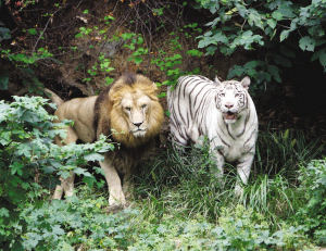 據(jù)了解,獅虎獸的父母是一只雄性非洲獅和雌性孟加拉白虎“小雪”,都是2002年在紅山動(dòng)物園出生的,一起生活在“獅虎生態(tài)園”,感情很好。當(dāng)初跟它們一起關(guān)進(jìn)園里的還有另外五只猛獸,包括兩只母獅,一公一母兩只虎,以及一只母白虎?墒沁@只雄性非洲獅就是喜歡跟“小雪”待在一起,對(duì)自己的同類——兩只母非洲獅反倒不理不睬。后來,工作人員先后移出了兩獅兩虎,園里只留下“小雪”、雄性非洲獅,和一只母東北虎。園子里“太平”了,“小雪”跟它的獅“哥”更是形影不離,親密不已,那只母東北虎成了“電燈泡”。