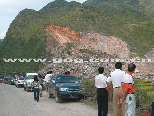 在山腳的左側(cè),是普定縣臨時搭建的搶險救援臨時指揮部,相關(guān)部門的人員正在緊張工作,在通往事故現(xiàn)場的公路上,幾臺大型裝載機(jī)、挖掘機(jī)正向現(xiàn)場駛?cè)ァ?/p>