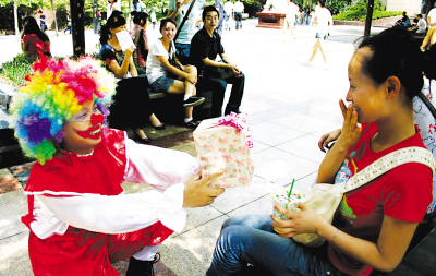 “小姐,你好,請(qǐng)接受我的禮物……”昨日中午,在沙區(qū)三峽廣場(chǎng),一名穿著紅色小丑服,手拿一盒包裝好的禮物,單膝下跪在一名漂亮女子面前。為了逗女孩開心,他還唱起《兩只老虎》,惹得路人哈哈大笑。然而,那名女子的神情卻非常驚訝……原來,小丑是一家道歉公司的員工,正按客人要求給人道歉。記者了解到,湖南男子彭敏于上月成立的“重慶快樂家族公司”,是本市首家專門幫人道歉的公司。